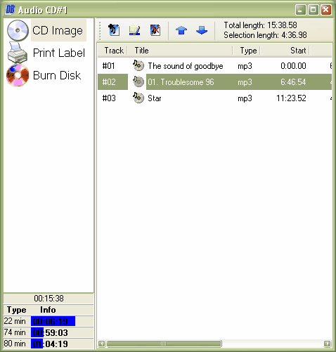 Now you can drag and drop audio files from your hard disk to the CD or add them by clicking the Add track(s) to layout icon or simply by pressing the Ins key on your keyboard. You can only use wav-, mp3-, and ogg- type of files (DeepBurner Pro has support for wma files).